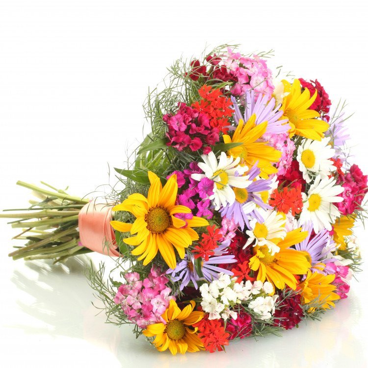 Букет оформлений в яскравих тонах, який поєднує ромашки, яскраві хризантеми та сезонні квіти