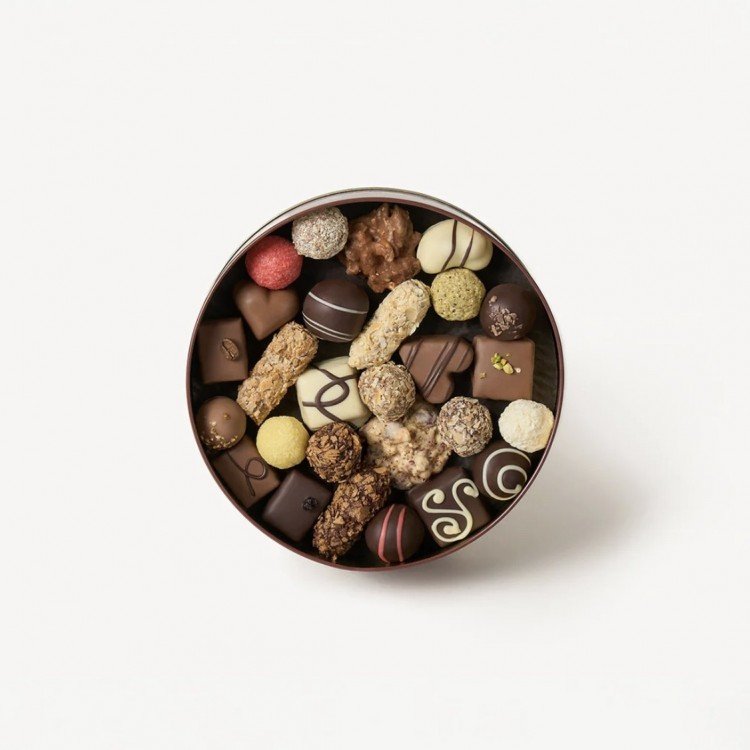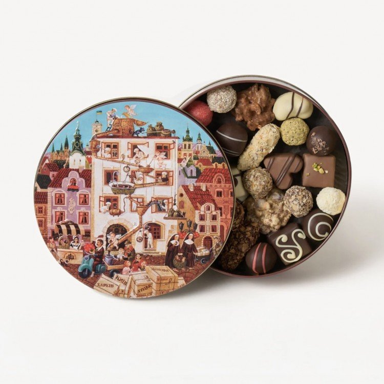 Набір з 27 пралінових, трюфельних та марципанових цукерок: Бернардинка, Біла Говерла, Білий вельон, Вишнева аграфка, Вишневий шпацер, Горіховий бандзьох, Пані Сливка в чорному шоколаді, Дзига в горісі, Дзига в кокосі, Кайзервальд, Карамелія, Королівська, Коханка, Львівські амурки, Полуничні цьомки, Серце Львова, Солодкі пацьорки, Софі, Фісташкові витрибеньки, Франц і Йосип, Фрау Рузя, Фрау Цимер, Цісарська, Чоколядовий бамбетель білий, Шоколатьє, Чоколядовий бамбетель чорний, Чоколядовий бамбетель карамельний