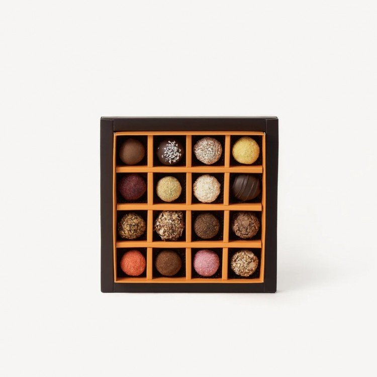 Набір з 16 добірних трюфелів: Оксамитовий трюфель, Дзиґа в кокосі, Львівська амурка, Дзиґа в горісі, Бонг, Класичний трюфель, Полуничні цьомки, Горіховий бандзьох, Малиновий шац, Віденський трюфель, Бернардинка, Мармурова фузія, Вишнева аграфка, Кокосова бузя, Фрау Цимер, Солодкі пацьорки.