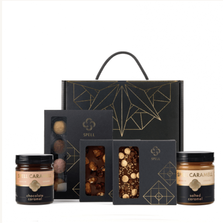 До набору входить: плитка молочного шоколаду з горіховим асорті, плитка шоколаду з солоною карамеллю та фундучним печивом, солона й шоколадна карамелі та асорті трюфелів.