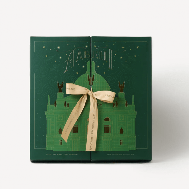 Ілюстрація театру – ззовні, ошатні картинні рами – всередині, за якими ховаються 24 шоколадні вироби. Кожен, наче витвір мистецтва, яким хочеться насолоджуватись щодня і який робить очікування свята ще смачнішим. Адвент-календар натхненний Львівським театром опери та балету і присвячений його 125-літтю.
