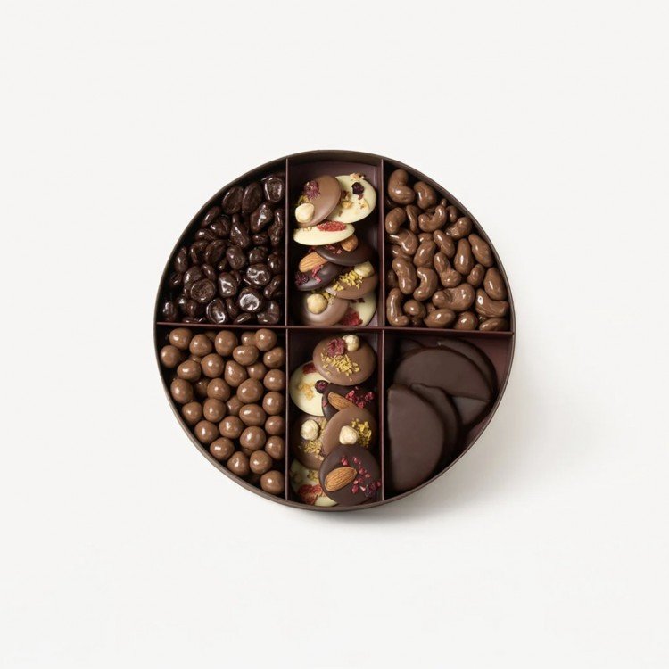 Палітра драже та сухофруктів. Фундук у молочному шоколаді, какао-боби та журавлина у чорному шоколаді, помаранчі в чорному шоколаді, а також "Шоколадні беретки" у трьох видах шоколаду.
