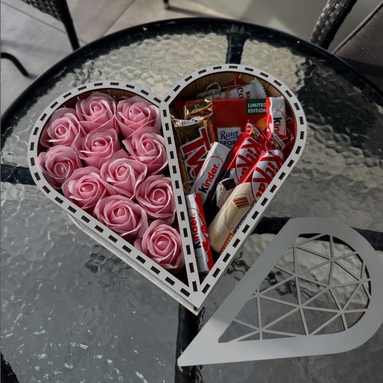 Подарунковий набір у формі серця з рожевими мильними трояндами та підбіркою популярних шоколадок — Kinder, Twix, KitKat і Ritter Sport. Ідеальний варіант для подарунку з ніжним акцентом.