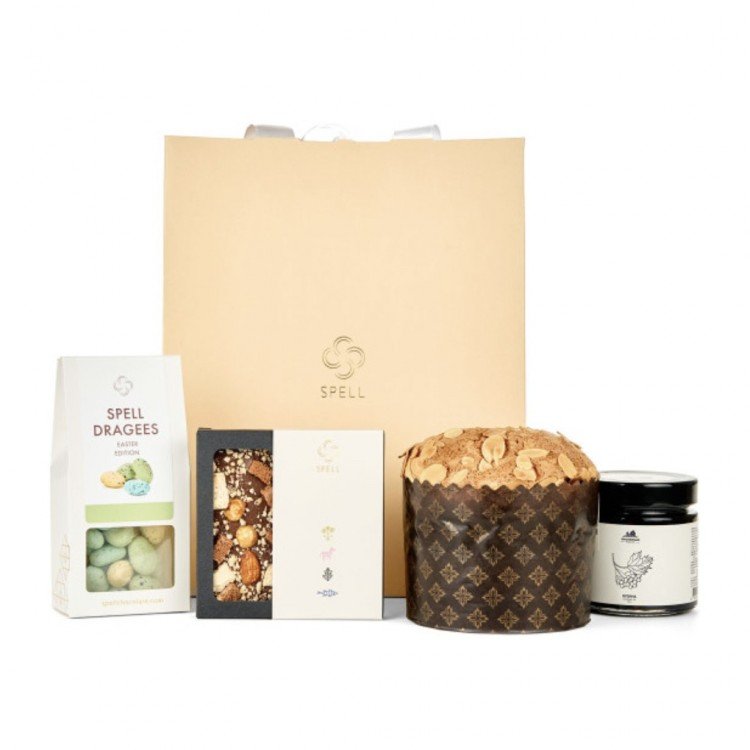 Подарунок, який робить сімейний Великдень теплим і простим. У кошику — паска від Марчук хліб, драже з мигдалем у білому шоколаді, бузина і плитка українського шоколаду з горіхами та меренгою.