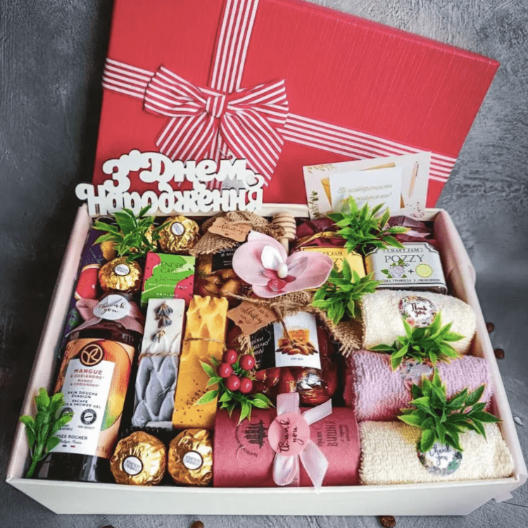 Продуманий подарунковий набір, у якому поєднуються доглядові засоби, натуральні солодощі та затишні деталі.